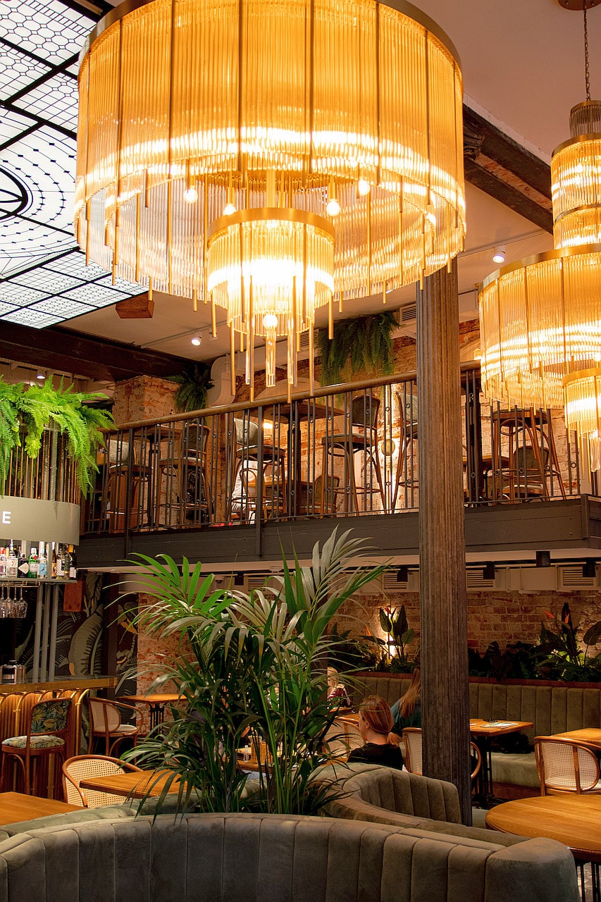 People, food, drinks, music and beautiful interior,